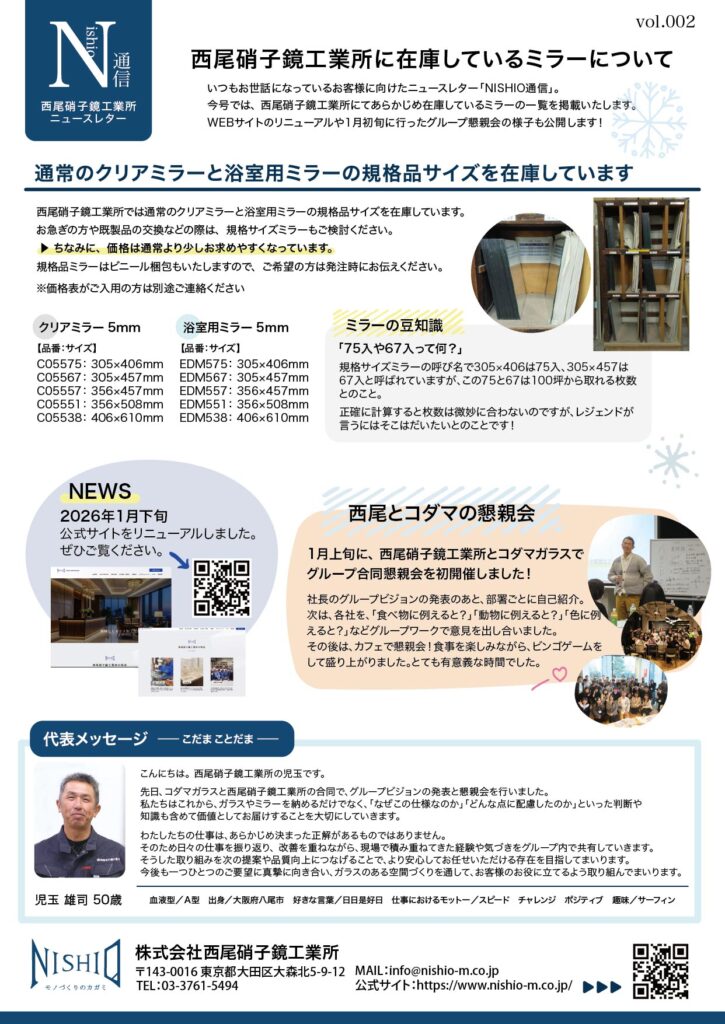 いつもお世話になっているお客様に向けたニュースレター「NISHIO 通信」。vol.002では、「 西尾硝子鏡工業所に在庫しているミラー」と「グループ懇親会について」について。 今後も役立つ情報を発信して参ります。よろし […]