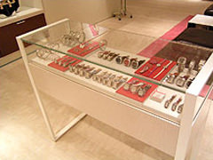 また、アクセサリーケースにも高透過ガラスを使用し、アクセサリーの色や美しさがそのまま伝わるようにしました。レジカウンターについては、金額を表示する部分のみ透明のままにし、その他の部分は裏側から白のカッティングシートを貼り付け、高級感あふれるカウンターにしています。