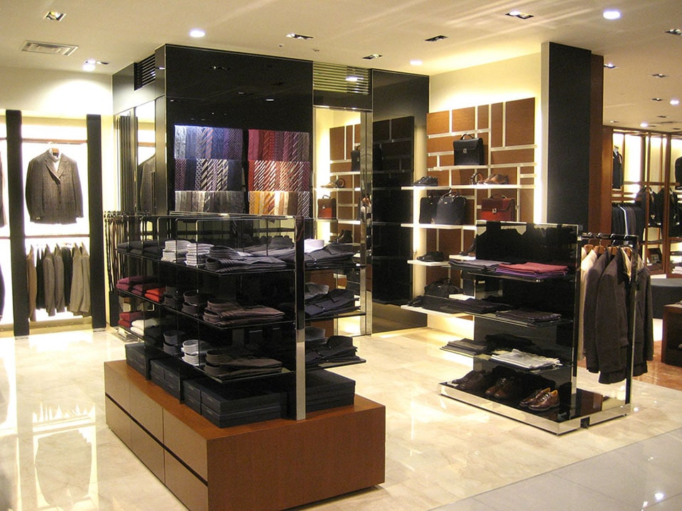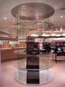 高級感を演出するために、壁面には黒色のカラーガラスを使用しています。什器に用いられているのは、グレーペンガラスです。ネクタイを掛ける部分にも、カラーガラスにグレーペンガラスを接着させており、細かいところまでこだわっています。グリッドに組まれたガラスの接着什器は、ガラスの寸法精度を要求されるため、見た目より難易度が高くなります。商品を最も魅力的に陳列できるよう、寸法精度には注意しました。