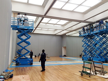 これだけの大きな面積に鏡を設置することはなかなかありませんので、高所作業車などを使い3日がかりで作業を行いました。天井から色や形が様々な照明を吊り下げる展示内容でしたが、照明の明かりが鏡に映りこみ幻想的な空間が演出できました。