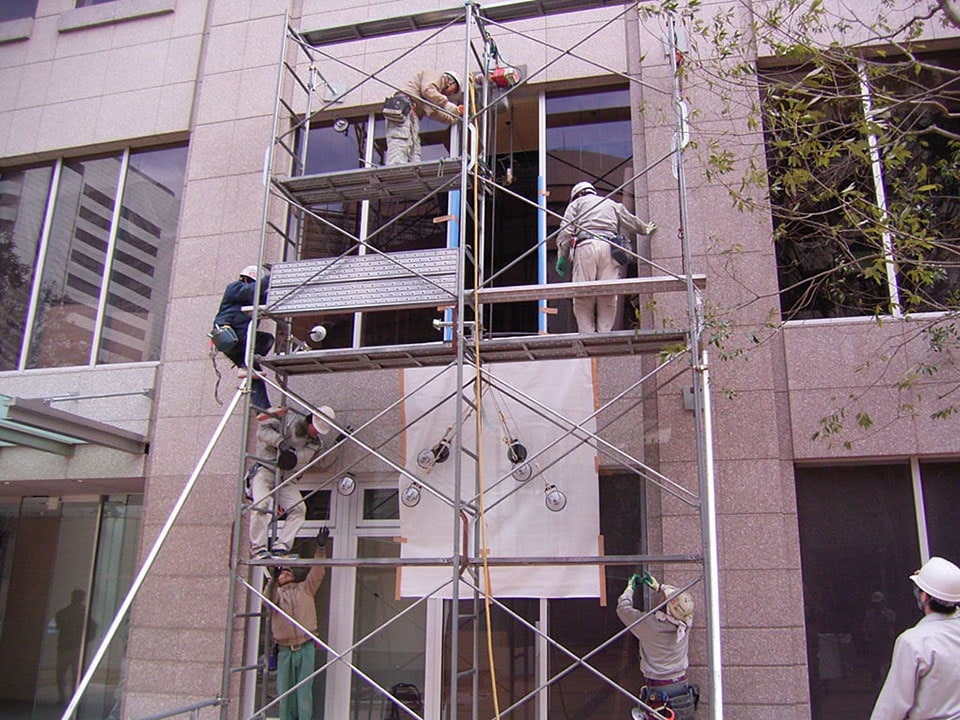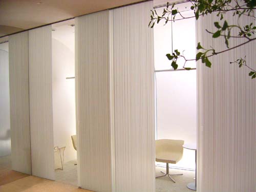また、カウンセリングで使用する部屋には、ストライプシートを貼り付けた吊り戸を設置することで、幻想的な雰囲気にしながらお客様のプライバシーを守っています。また、サロン内には6ミリクリアミラーの連続施工で映っているものをひとつに見せる鏡を設置しており、こちらは調整に最も神経を使った自信の逸品です。