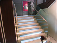 銀座6丁目本店の地下1階の正面には、一枚ものの強化ガラスを設置することで、店内を印象付けています。階段は安全性を考慮して、手すり部分に強化ガラスを用いりました。階段近くにある壁面のタペストリーミラーは、柔らかい雰囲気を演出しています。
