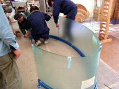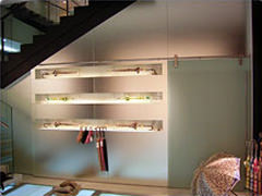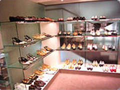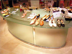 また、4階のメインディスプレイは、円形状のガラスを脚として、その上に曲げガラスを取り付けています。靴を並べる陳列台には、スリムライトカバーを取り付け、商品の邪魔にならないように配慮しています。また、パウダールームの鏡は、部分的にタペストリーミラーにすることで、スタイリッシュな雰囲気にしました。